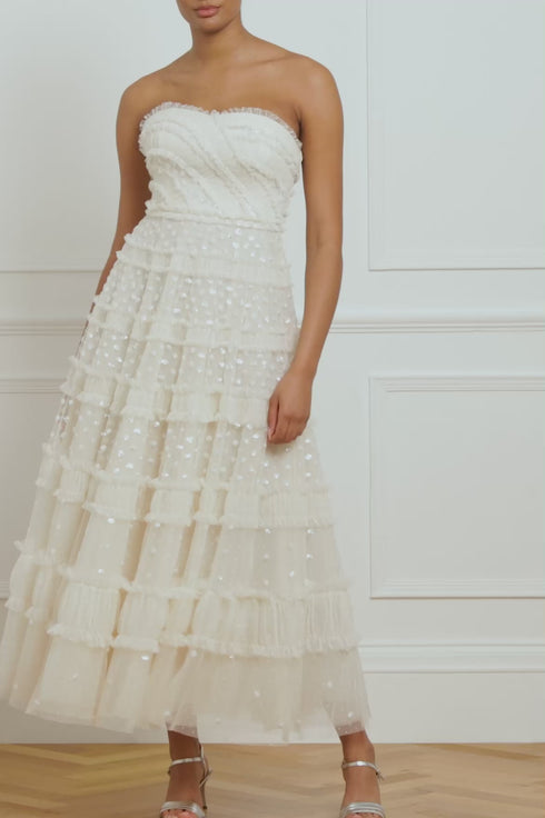 The Dot Shimmer Open Midaxi Cape in Cream. This cape is beautifully adorned with sequin dot motifs creating an enchanting and glistening effect. This statement piece layers perfectly over our Dot Shimmer Tiered Strapless Ankle Gown. Designed with a purposely shaped front opening to reveal the dress whilst maintaining modesty. The perfect styling piece.
