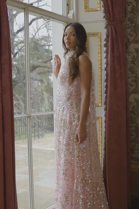 NEW SEASON. The Dream Garland Strapless Gown in Seashell/Multi. A romantic design adorned with delicate floral embroidery and subtle shimmer. Cut with a flattering strapless neckline and a flowing full skirt, this gown radiates effortless elegance and refined beauty.