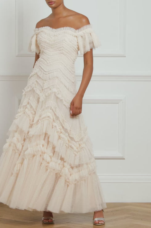 The Elia Off-Shoulder Gown in Dust Beige. This textile gown is beautifully designed with soft, delicate tulle ruffles that gradually increase in size towards the hem. Crafted with a romantic off-the-shoulder design and developed using layers of soft tulle trimmed with frills, adding to this statement look. The internal corset construction in stretch power-mesh ensures comfort and fit while maintaining the garment's shape and hold. The skirt is made up of generous layers of net and tulle with a sweeping hemline. Expect all eyes on you in this statement style.