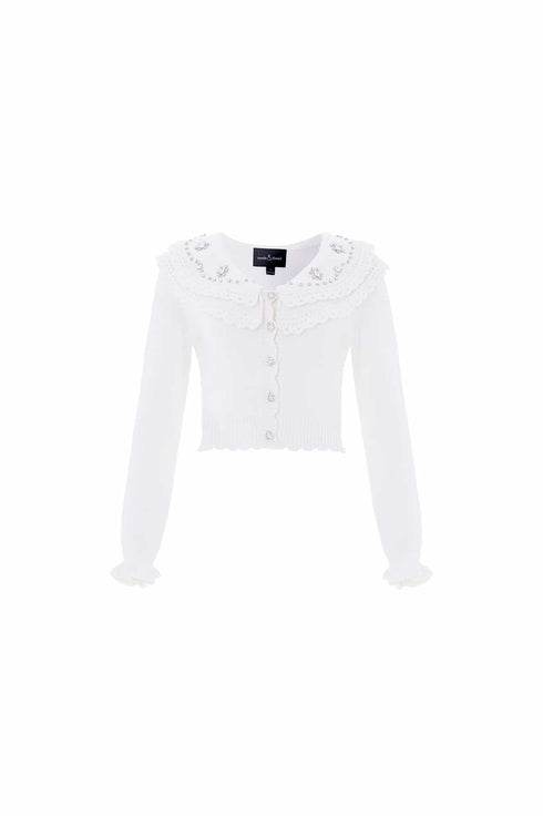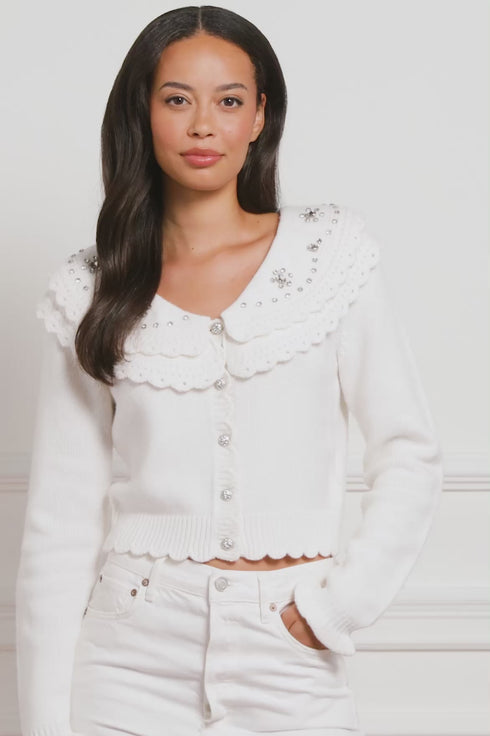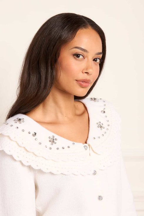 NEW SEASON | NEEDLE & THREAD EXCLUSIVE. The Embellished Collar V-Neck Cardigan in Cream. A refined knitwear piece with an elevated twist. Crafted from soft yarn and finished with a delicately embroidered collar, this cardigan adds a romantic touch to everyday looks. Wear buttoned up with the Ballet Kisses Ankle Skirt, or layer over a dress for a feminine contrast.