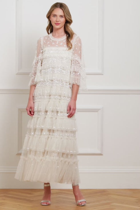 NEW SEASON | NEEDLE & THREAD EXCLUSIVE. The Emily Lace Ankle Gown in Cream. This gown features delicate sequin embellishments in vintage-inspired border designs. Signature Needle & Thread tulle frills cascade gracefully down the silhouette, increasing in size toward the hem for a dramatic, sparkling finish. Fluted sleeves with leaf motifs and frilled cuffs add a charming touch, while the relaxed, tiered shape offers both elegance and ease. A timeless gown that blends vintage romance with modern refinement.
