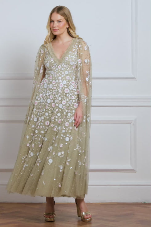 NEW SEASON. The Ethereal Blooms Cape Sleeve Ankle Gown in Aloe/Multi. Features delicate floral embroidery inspired by vintage archive prints. Crafted from flowing tulle, the gown is designed with soft cape sleeves and a romantic A-line skirt, creating a light, graceful finish.