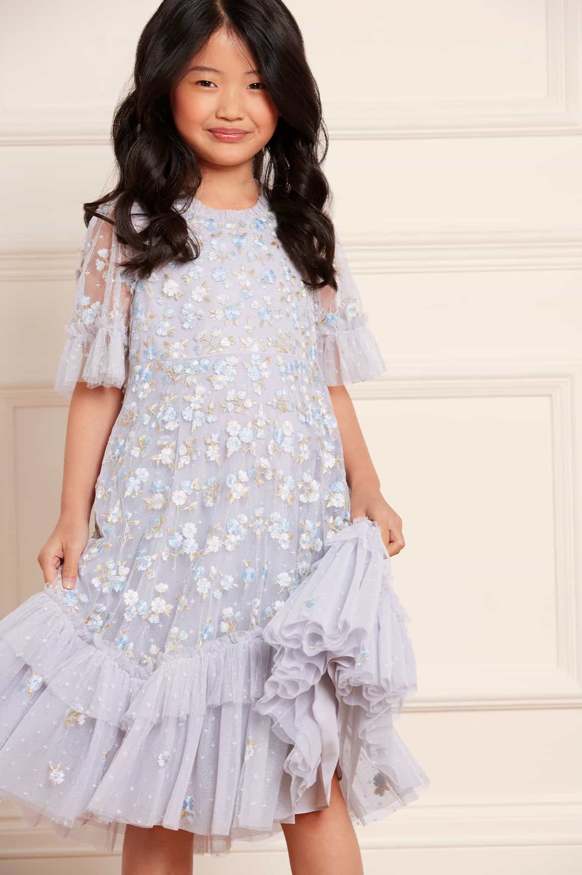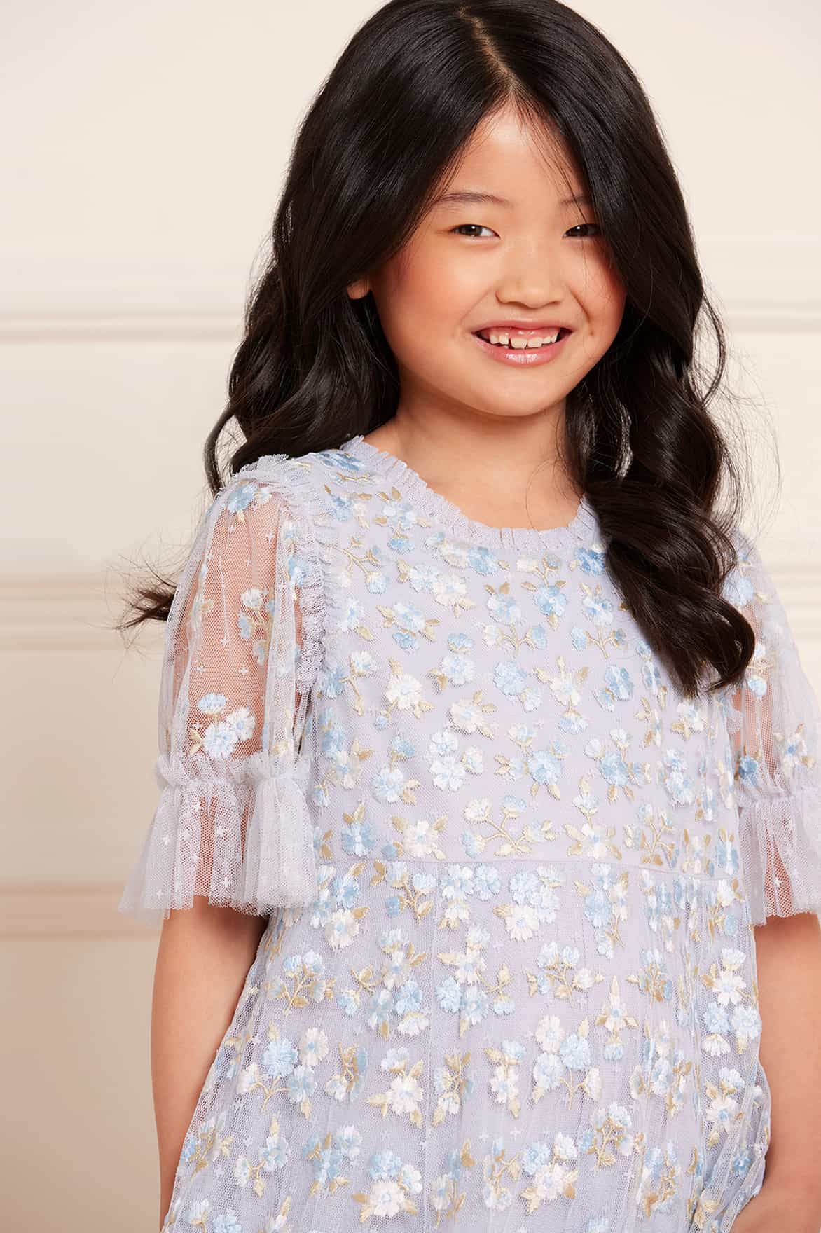 NEW SEASON. The Evening Primrose KIDS Dress in Cornflower Blue. This dress is decorated with intricate floral embroidery, inspired by a 1930’s tea dress. Beautifully engineered with chevron frills on the hem. Developed with our signature Needle & Thread tulle. The perfect dress for all your little one's upcoming occasions.