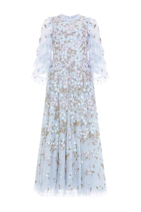 The Everett Bloom Round Neck Ankle Gown in Dusk Blue/Multi. This beautiful gown features exquisite, embroidered artwork inspired by a vintage archive print that showcases floating florals. Beautifully decorated with floral clusters cascading gently toward the hem, enhancing the romantic charm. Designed with fluted sleeves adorned with frothy tulle ruffles and embroidered floral motifs, while the neckline, shoulders, and cuffs feature signature Needle & Thread tulle frills for a touch of romantic elegance. The skirt is composed of generous layers of net and tulle, culminating in a sweeping hemline that adds to the gown's enchanting allure.