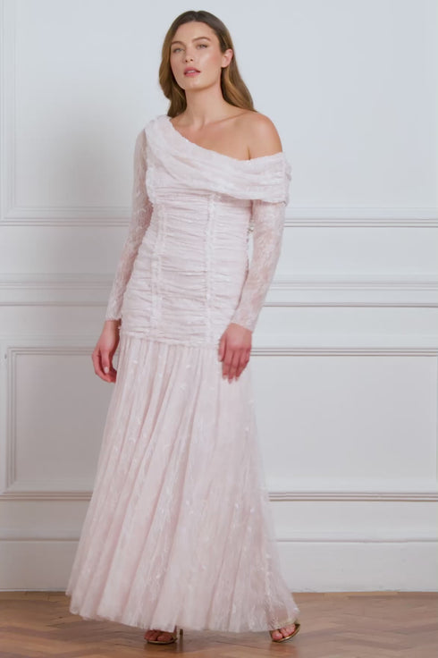 NEW SEASON. The Gigi Lace One-Shoulder Rouched Gown in Seashell. Crafted from delicate lace with subtle ruching through the bodice. This graceful, modern silhouette offers a refined take on romantic evening dressing, perfect for elegant occasions.