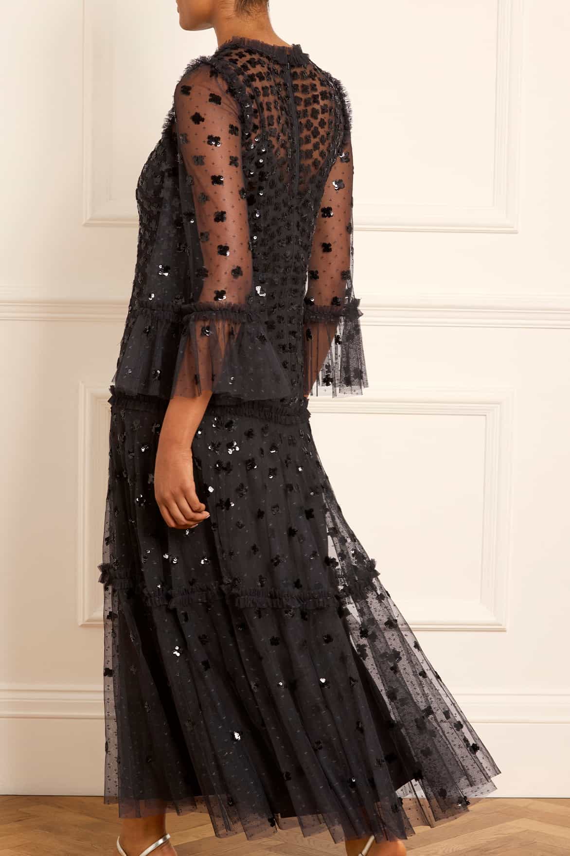 - Semi-fitted through the bust with a relaxed fit through the waist and hips. Full multi-layered skirt.