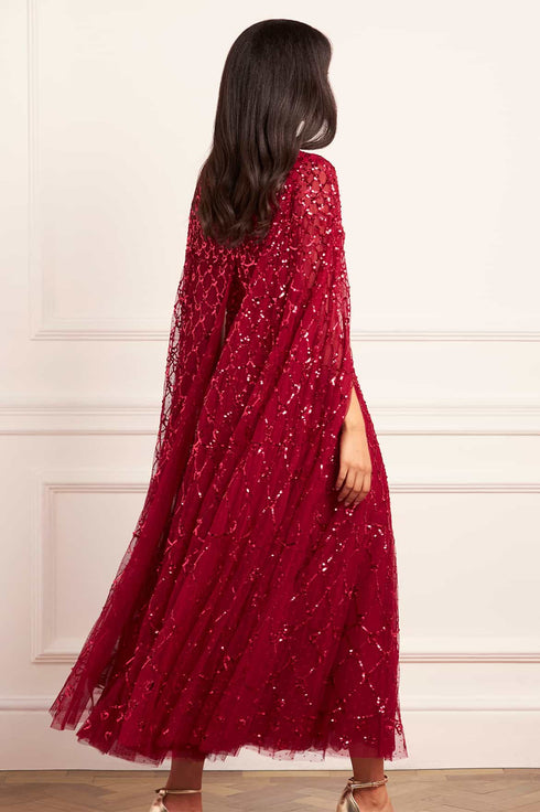 NEW SEASON. The Heart Lattice Ankle Gown in Red. Inspired by the eternal romance of the Bright Star collection, this gown is adorned with embroidered heart motifs entwined within a lattice of sequins, reminiscent of Victorian artwork. Crafted in layers of airy tulle, the fitted bodice and softly flared skirt echo the rhythm of poetry, while the bold red palette amplifies its passion. A gown designed for moments that feel as timeless as the stars.