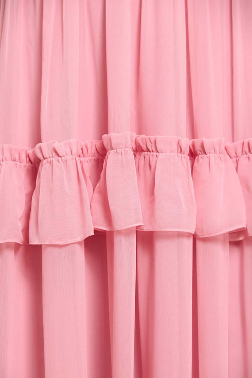 The Isabel Chiffon Strapless Ankle Gown in Sugar Pink is a heritage Needle & Thread style. The bodice features intricate, ruched chiffon with signature ruffles and an internal corset for comfort and shape. The ethereal skirt has gently gathered tiers, each edged with topstitched frills for a romantic touch. Crafted from soft, semi-sheer chiffon, the gown offers a flowing silhouette and is fully lined for easy wear. A timeless addition to your wardrobe.