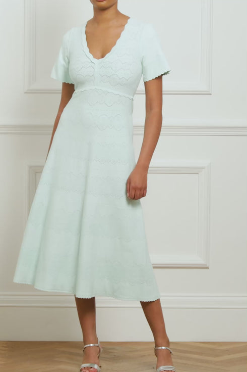 NEW SEASON. The Lace Knit Gown in Menthol Green. This knitted gown is developed from recycled viscose blend, with stretch yarn for a beautiful, flattering texture. Decorated with stitch pointelle details inspired by vintage woven lace ribbons. Crafted with a fitted stretch bodice, a feminine V-neckline and scalloped trim details for a romantic look. This easy-to-wear piece is the perfect wardrobe staple.