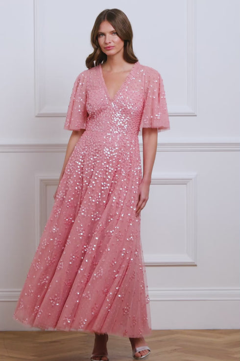 The Leila Dot V-Neck Cape Ankle Gown in Primrose is embellished with shimmering clustered dot motifs for a sparkling effect. This elegant V-neck gown features slim sleeves and signature Needle & Thread tulle frills at the neckline and armholes. The skirt, crafted from layers of net and tulle, finishes with a sweeping hemline. A captivating design.