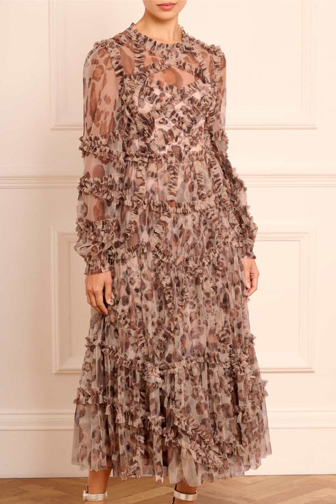 The Leopard Diamond Ruffle Ballerina Dress in Moonshine. This statement print was hand-painted in-house using watercolour, with soft leopard motifs varying in scale and featuring watery definition. Inspired by Victorian styling, this piece includes pretty engineered ruffle details and voluminous blouson sleeves with an elasticated cuff adorned with frill detailing. The skirt offers a flattering fit that skims the body and gently increases in fullness, creating stunning movement within the tulle. Make this piece your new wardrobe favourite.