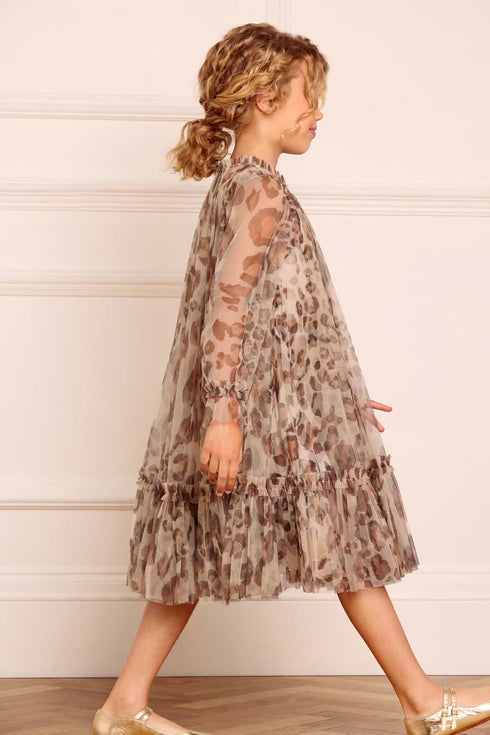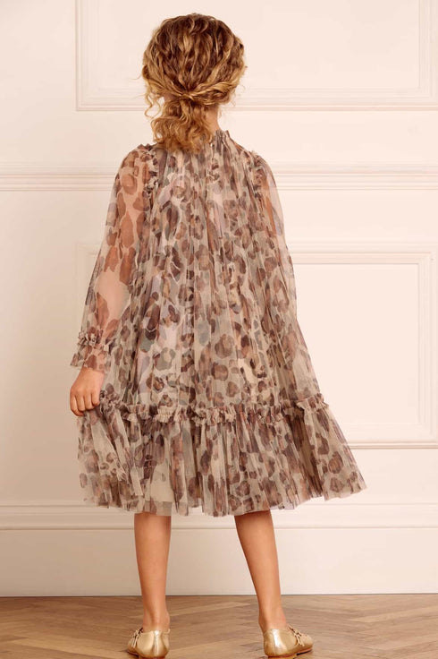 The Leopard Long Sleeve Kids Dress in Moonshine. This statement print was hand-painted in-house using watercolour. Featuring soft leopard motifs that vary in scale with a watery definition. Developed with a signature Needle & Thread silhouette featuring a voluminous trapeze shape, perfect for twirling. Designed with elasticated cuffs and pretty frill details. Created in our soft tulle fabric for a floaty, fluid shape. The perfect dress for all your little one's upcoming occasions.