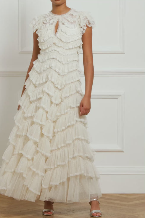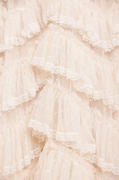 The Libby Lace Gown in Cream. A new statement piece for the season ahead. Beautifully adorned with gathered tulle frills in soft zig-zag borders and delicate lace trims for intricate, signature detailing. Developed with layers of tulle to create frothy textured sleeves and a keyhole neckline for a romantic look. Expect all eyes on you in the Libby Lace.