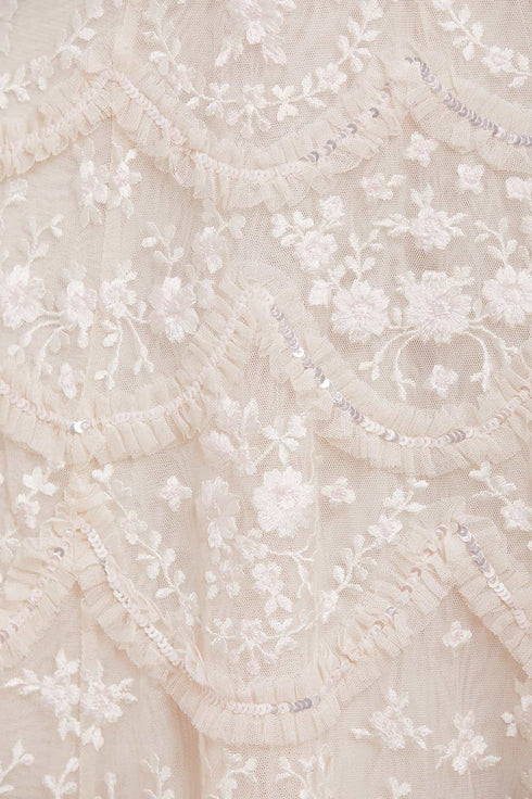 The Lily Bloom Ankle Gown in Cream. This ankle gown is beautifully designed with delicate tulle ruffles and soft scallop shaping for signature Needle & Thread styling. Adorned with intricate floral embroidery and trimmed with a high shine sequin adding shimmer throughout. Make the Lily your new wardrobe addition.