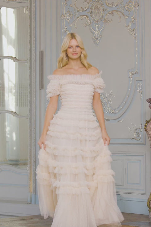 The Lisette Ruffle Off Shoulder Gown in Champagne. This statement gown has an elegant off-the-shoulder design inspired by Hollywood styling. Crafted with textile tulle and double-stitched frills for a dramatic, romantic effect. Features an integrated corset for a perfect fit and to hold the silhouette. Expect all eyes on you in this romantic gown.