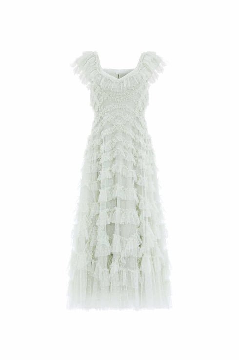 The Lola Backless Ballerina Dress in Mist, a beautiful new addition for the season. Adorned with signature Needle & Thread elements, this dress features soft tulle and delicately gathered frills, creating a frothy, engineered texture. The backless design adds a romantic, playful touch, while the ballerina-length skirt enhances its graceful silhouette. Perfect for weddings, birthdays, or any special occasion, this dress promises to be a showstopper.