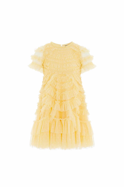 The Marilla Ruffle KIDS Dress in Lemon. Beautifully designed with frothy tulle and interlocking scallop shapes to create a playful texture. This pretty style features elegant short sleeves, a round neckline and a full skirt. The perfect statement style for your little one.