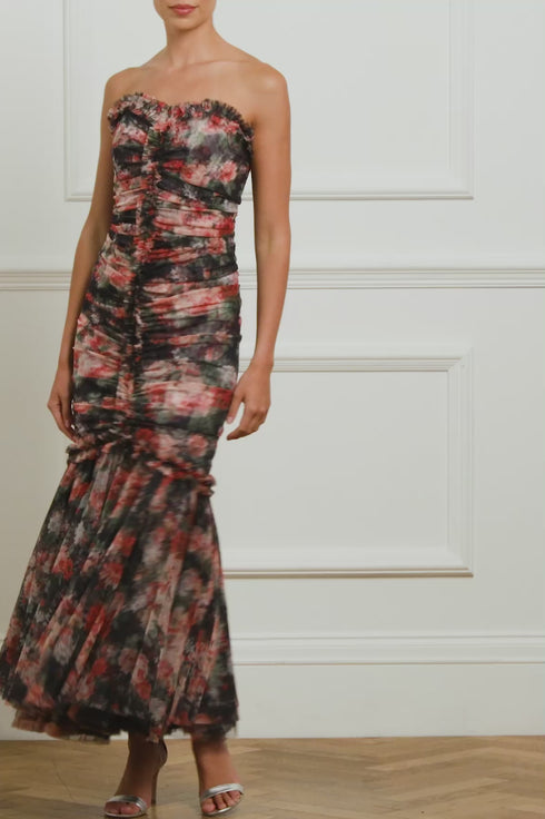NEEDLE & THREAD EXCLUSIVE. The Midnight Dance Strapless Ankle Gown in Graphite. Beautifully printed with a floral design featuring luxurious blooms taken from archive, hand-painted artwork from the early 1900s. This gown features a slim silhouette with soft, flattering drapes across the body. The statement fishtail skirt is crafted from layers of signature Needle & Thread soft tulle and net for added drama. The elegant V-neckline is adorned with frothy tulle ruffles, featuring long slim sleeves. Crafted with signature Needle & Thread frills on the shoulder, skirt seam, and bodice for a touch of romantic styling. This gown creates the most stunning movement as you walk.
