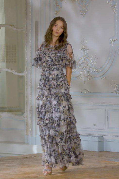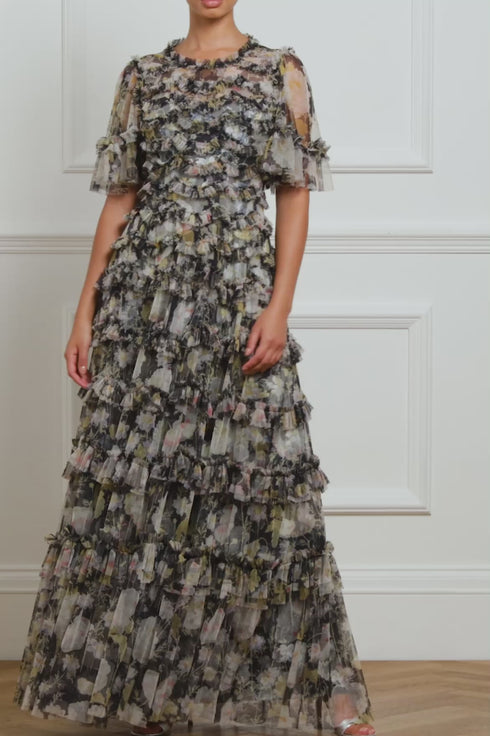 The Moonlight Petals Round Neck Gown in Graphite. The print of this gown is taken from a 1900's hand-painted artwork. Beautifully printed with soft white peonies and silvery blue wildflowers creating an enchanting print. Crafted with signature Needle & Thread detailing featuring delicate tulle frills, scallop shape borders and frills creating romantic texture throughout. You can dress the Moonlight up or down depending on the occasion.