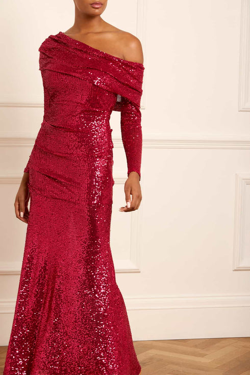 The Nova One-Shoulder Ankle Gown in Red. This gown is inspired by vintage Hollywood glamour. Beautifully designed with an elegant off-the-shoulder structure. Adorned all over with tiny glittering sequins for the ultimate statement. Crafted with a slim silhouette enhanced by soft drapes across the body, leading to a fluid sweeping skirt. The perfect romantic style for an upcoming special occasion. We hope you adore this new style as much as we do at Needle & Thread head office.