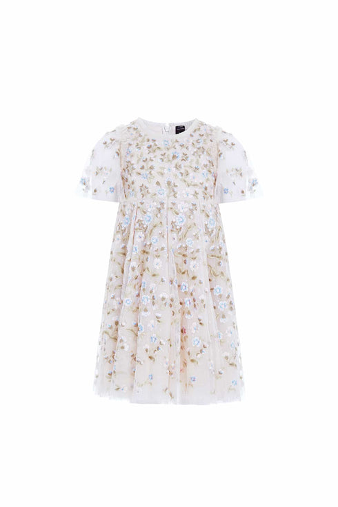 The Posy Pirouette KIDS Prom Dress in Cream / Blue. A brand new statement style for this season. Beautifully designed with intricate, rich embroidered artwork inspired by our ‘summer posy’ print. Developed with posy florals scattered all over and dispersing towards the hem, creating a pretty embroidery design. The skirt is made from generous layers of net and tulle, creating a sweeping hemline. The perfect dress for all their upcoming special events.