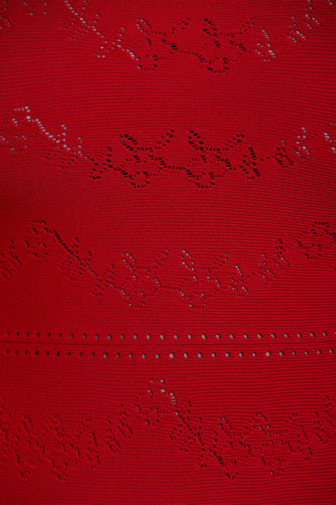 The Pretty Pointelle Knit Scoop Neck Mini Dress in Red. A brand new style for Needle & Thread. This knitted dress is inspired by vintage ditsy florals and lace. Beautifully designed with all-over pretty pointelle stitch, delicate florals and scallop details. This dress has a fitted stretch bodice with a soft, feminine neckline, fluted cuffs and signature Needle & Thread detailing. A truly flattering piece.