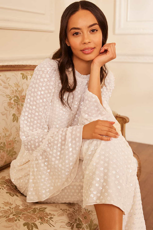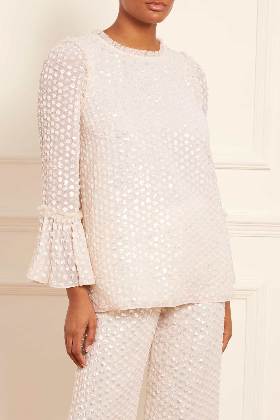The Raindrop Gloss Tunic in Cream. This top is beautifully adorned with scattered sequins, adding a romantic, shimmering effect. Designed with the most exquisite sequins with an extra foil coating to create an ultra-high shine finish. This relaxed tunic is designed with an easy-wear, loose fit silhouette. Developed with exaggerated cuff details and voluminous, gathered frill for signature Needle & Thread details. Pair with the matching Raindrop Gloss Skirt for the full Needle & Thread look.
