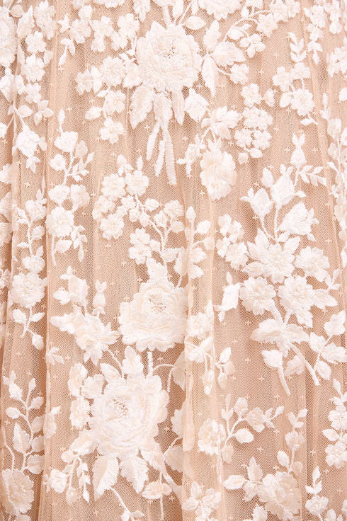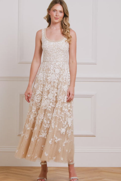 NEW SEASON. The Rosa Scoop Neck Ankle Gown in Beige/Cream. Vintage-inspired rose embroidery in soft tonal hues decorates the bodice of this dress. The floral motifs bloom from the centre and trail down the skirt into delicate ditsy clusters. With a flattering scoop neckline and flowing silhouette, this gown is ideal for romantic occasions and evening elegance. Complete the look with a drama flair by adding the Rosa Hooded Cape.