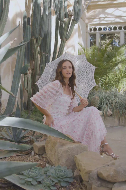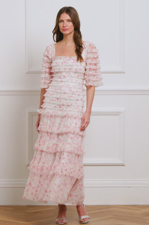 The Rose Ditsy Short Sleeve Ankle Gown in Moonshine/Pink. This gown features a romantic floral print inspired by 1800s hand-painted wallpaper. The slim silhouette is shaped with two layers of stretch power-mesh for comfort and support. Crafted with delicate tulle sleeves and skirt add to its ethereal charm, while signature Needle & Thread frills create a flattering, flowing effect. The square neckline, fluted sleeves, and gathered skirt bring elegance and timeless beauty to this gown. A piece you'll cherish forever.