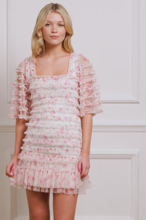 The Rose Ditsy Short Sleeve Micro Mini Dress in Moonshine/Pink. This gown features a romantic floral print inspired by 1800s hand-painted wallpaper. The slim silhouette is shaped with two layers of stretch power-mesh for comfort and support. Crafted with delicate tulle sleeves and skirt add to its ethereal charm, while signature Needle & Thread frills create a flattering, flowing effect. The square neckline, fluted sleeves, and gathered skirt bring elegance and timeless beauty to this gown. A piece you'll cherish forever.