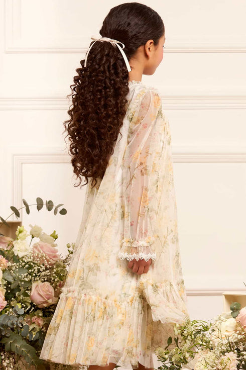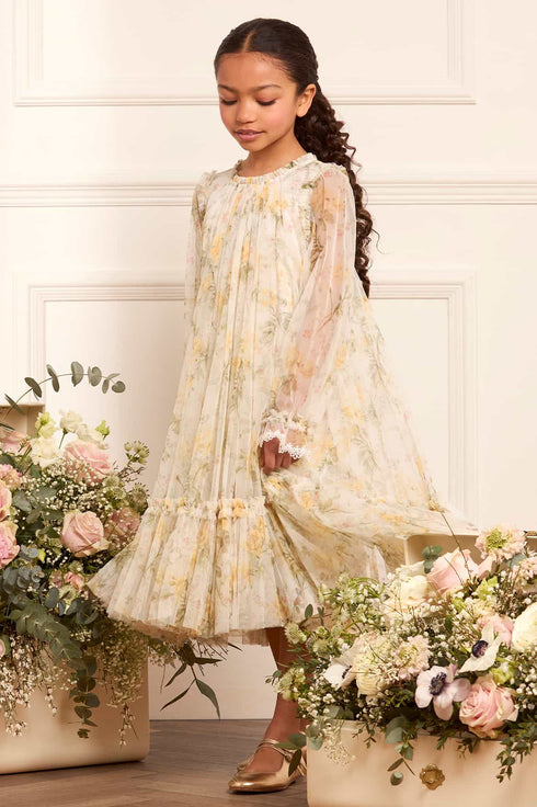 The Rose Long Sleeve Kids Dress in Moonshine/Yellow. This dress features an enchanting print of large rose blooms and trailing florals, inspired by early 1900s hand-painted artwork. Designed with a relaxed trapeze silhouette and a tiered hem, it offers a voluminous, twirl-worthy style that’s both playful and comfortable.