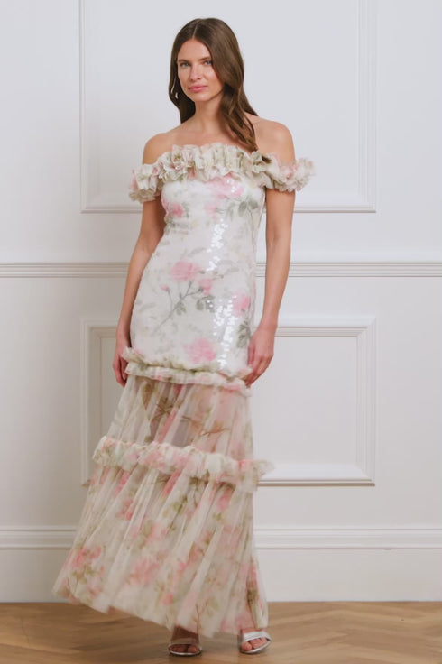 The Rose Tallulah Off-Shoulder Gown in Moonshine/Pink features a romantic print inspired by antique hand-painted artwork with large rose blooms and trailing florals. The off-shoulder neckline, adorned with frothy tulle frills, adds dramatic flair, while the stretch power mesh bodice offers a flattering fit. The sheer tulle skirt, with frill tiers and a sweeping hemline, creates an unforgettable silhouette for special occasions.