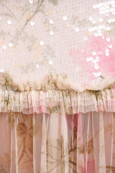 The Rose Tallulah Off-Shoulder Gown in Moonshine/Pink features a romantic print inspired by antique hand-painted artwork with large rose blooms and trailing florals. The off-shoulder neckline, adorned with frothy tulle frills, adds dramatic flair, while the stretch power mesh bodice offers a flattering fit. The sheer tulle skirt, with frill tiers and a sweeping hemline, creates an unforgettable silhouette for special occasions.