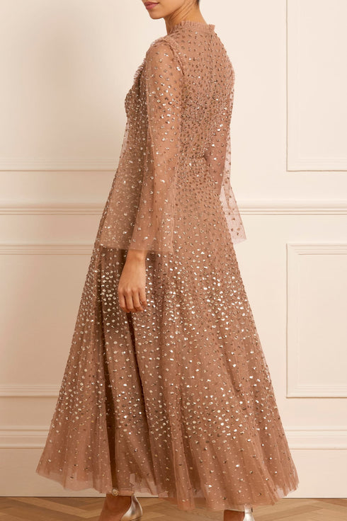 The Scatter Dot Round Neck Ankle Gown in Mocha. This embellished gown is decorated with exquisite shimmering dot motifs, undulating in wave formations for a captivating glittering effect. The round neck bodice is trimmed with signature Needle & Thread tulle trims at the neckline and shoulders for romantic detailing. The elegant long fluted sleeves are adorned with tiny sparkling sequin motifs, and the skirt is made up of generous layers of net and tulle with a sweeping hemline. This magical piece is perfect for an upcoming special occasion and beyond.