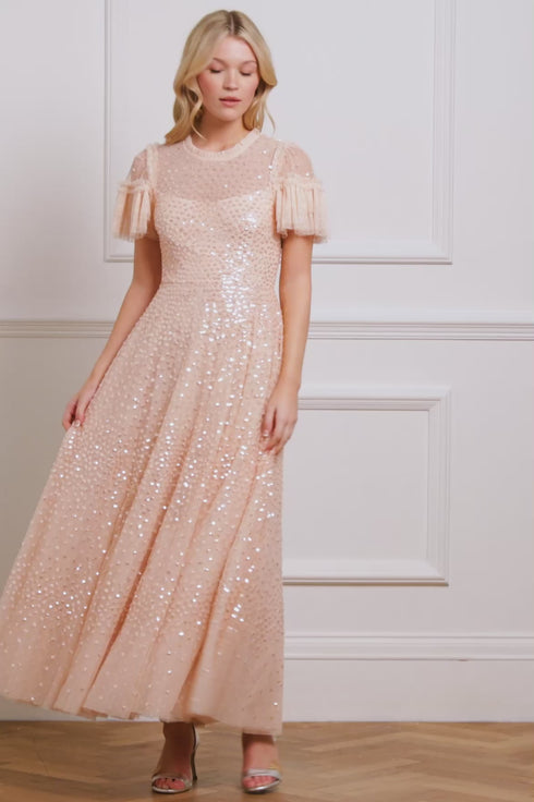 The Scatter Dot Round Neck Short Sleeve Ankle Gown in Apricot. This gown features shimmering dot motifs that fade towards the hem, creating a captivating glittering effect. The sequins have a high-shine finish, enhanced by a foil coating. Frothy tulle frills edge the neckline, shoulders, and waist, while romantic fluted sleeves are finished with delicate frills. The voluminous skirt, made from layers of net and tulle, creates a dramatic, elegant hemline. This magical gown is perfect for any special occasion.