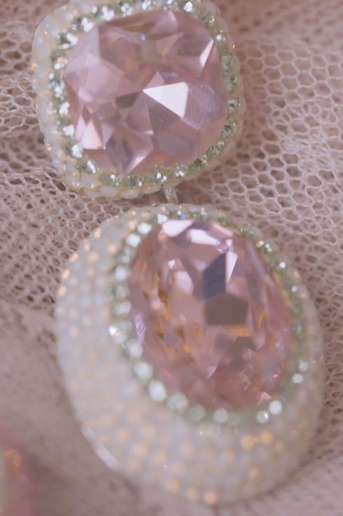 The Sentimental Rose Drop Earrings in Opal Rose. A special edition colourway for the Needle & Thread x Soru collaboration. These special handmade earrings are 18kt gold plated silver, beautifully developed with square and oval cut rose pink glass crystals, framed with soft green micro crystals for your 'pretty in pink' moments. These sparkling drop earrings are a fun addition to any outfit and are bound to be your new jewellery box favourite.