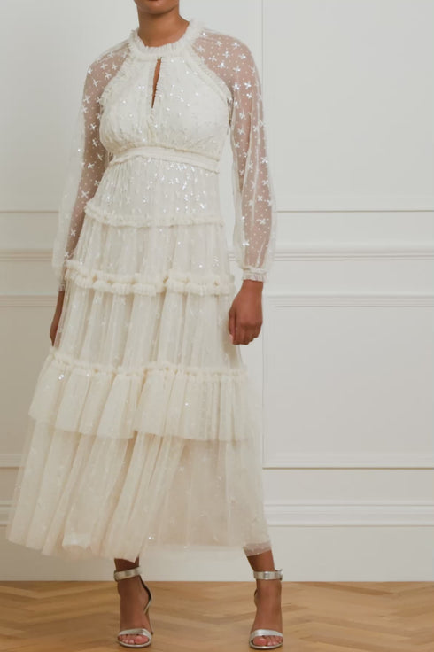 The Sequin Kisses Ankle Gown in Cream. Beautifully adorned with intricate star motifs scattered throughout, creating an enchanting, shimmering effect. This flattering gown is developed with a smocked waist, long sleeves and tulle frill detailing. Designed with elasticated cuffs and a keyhole neckline for an effortless look. The perfect gown for an upcoming special occasion.