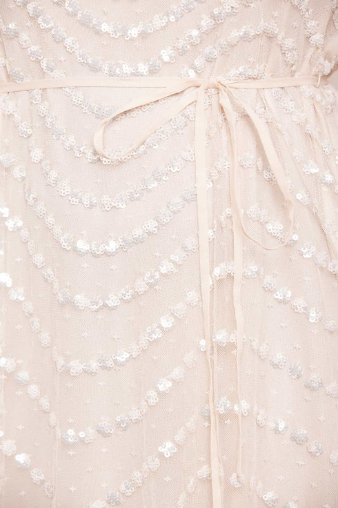 NEW SEASON | NEEDLE & THREAD EXCLUSIVE. The Shimmer Wave Gloss One-Shoulder Ballerina Dress in Cream. This ballerina dress is developed with a one-shoulder design and a generous, voluminous sleeve for elegant detail. Adorned with a shimmering artwork in high gloss sequins. This style is inspired by the sea waves of the Riveria, featuring delicate sequins creating undulating borders for a romantic, glistening effect. The skirt is made up of layers of signature Needle & Thread soft tulle. A Needle & Thread season favourite.