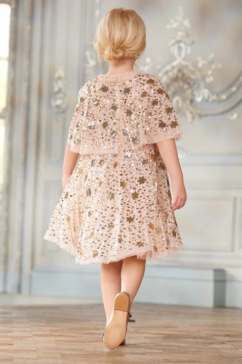 The Shooting Stars KIDS Dress in Dust Beige/Silver. This dress is inspired by the extravagant costumes worn by the Follie’s dancers of the early 1900s. Beautifully decorated with embellishments of intricate star motifs, with clusters of tiny sparkling sequins that scatter towards the hem, creating a shimmering effect. The dress is adorned with signature Needle & Thread tulle ruffles and frills. The skirt features generous layers of net and tulle with a sweeping hemline, perfect for twirling. The loose-fit silhouette ensures easy-to-wear styling. This dress captures the magic of fairytales and the beauty of the night sky.