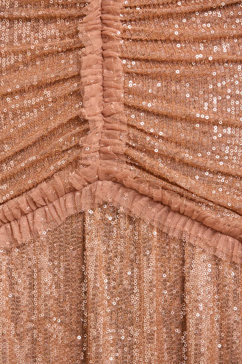 The Starlight Long Sleeve Gown in Caramel. Specially developed all-over sequin fabric is created using the tiniest 3mm sequins, carefully and delicately stitched to the stretch mesh base to create a shimmering effect. Expertly draped in our London atelier, the fabric is gathered with tulle frill details to perfect the flattering silhouette and add statement Needle & Thread styling. Fully lined in heavier-weight power mesh, the gown ensures ultimate fit and comfort. The frill-edged V neckline and slim sleeves complete the elegant silhouette. The perfect gown for an upcoming special occasion.