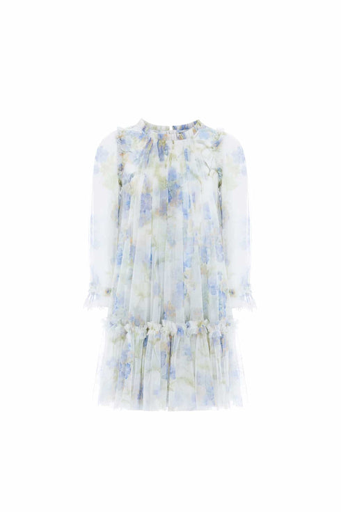 The Summer Posy Long Sleeve Kids Dress in Moonshine. This dress is printed with a beautiful artwork taken from a 1930's hand painted wallpaper design, featuring powder blue scattered posies and vintage inspired embroidery. Crafted in a trapeze shape for a relaxed and easy-to-wear fit and featuring a smocked panel detail yoke. This style is made from our tulle fabrication. A new season favourite.