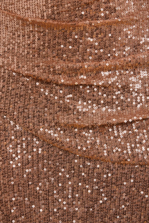 The Sunbeam Valentina Off-Shoulder Gown in Mocha. Turn heads in the dazzling gown. Featuring shimmering 3mm sequins on stretch mesh, an off-shoulder silhouette, and a fluid skirt, this design exudes timeless elegance. Crafted with romantic puff sleeves and soft draping flatter the figure, while an internal corset ensures comfort and support. Perfect for glamorous soirées, this gown promises unforgettable sophistication.