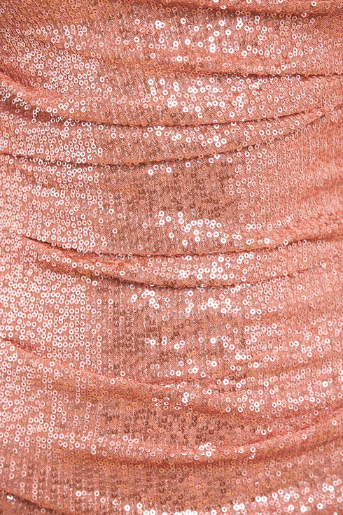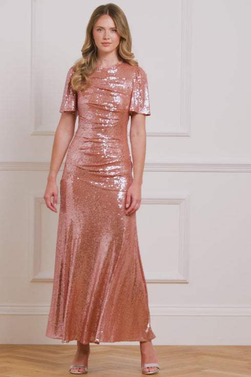 NEW SEASON. The Valentina Round Neck Gown in Cinder Rose. This gown is a sophisticated style featuring sequins that shimmer and shine. The round neckline and cap sleeves create a flattering upper silhouette, while the ankle-length hem adds elegance. Perfect understated glamour for unforgettable moments.