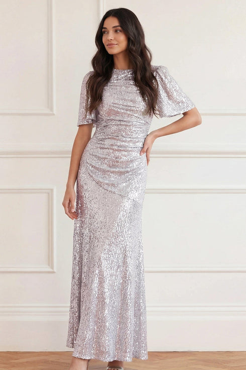 NEW SEASON | NEEDLE & THREAD EXCLUSIVE. The Valentina Round Neck Gown in Dove/Silver. An elegant silhouette crafted for special occasions. Designed with a softly structured bodice and flowing skirt, it offers timeless romance with a luxurious shimmer finish.
