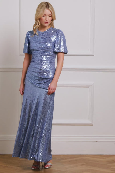 The Valentina Round Neck Gown in Sky Blue features a slim silhouette with soft drapes for a graceful fit. The glittering sequins, stitched to a stretch mesh base, create a pretty shimmering effect. The fluid skirt flows beautifully, and gently gathered fluted sleeves add a romantic touch. Coated with extra foil, the sequins offer a high-shine, lustrous finish, making this gown perfect for any elegant occasion.