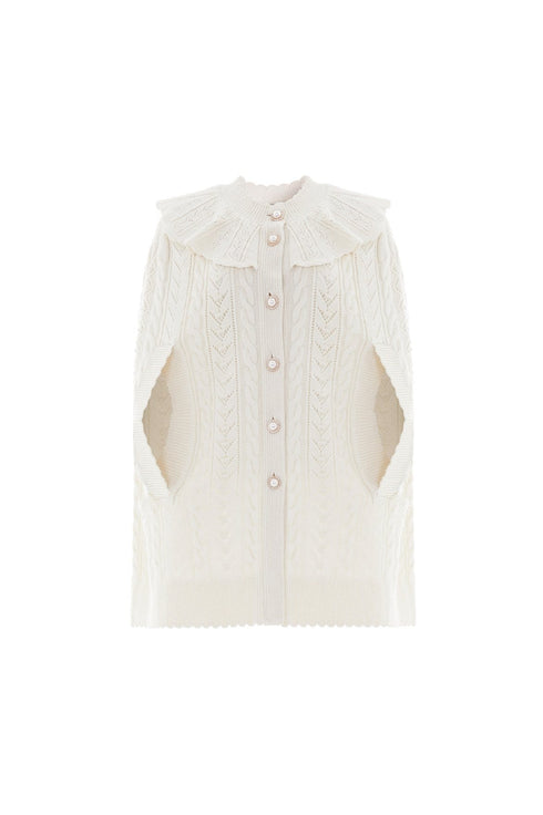 NEEDLE & THREAD EXCLUSIVE. The Victoriana Cape in Cream. This beautiful cape is made from soft wool and decorated with faux pearls and crystal-embellished buttons for a luxe finish. It features delicate stitches, mixed cables and bobbles. Make this feminine cape your new styling piece.