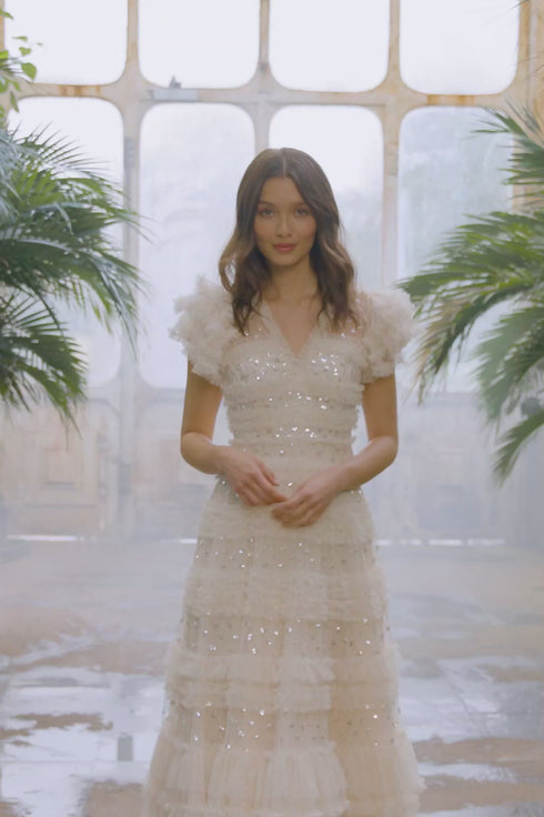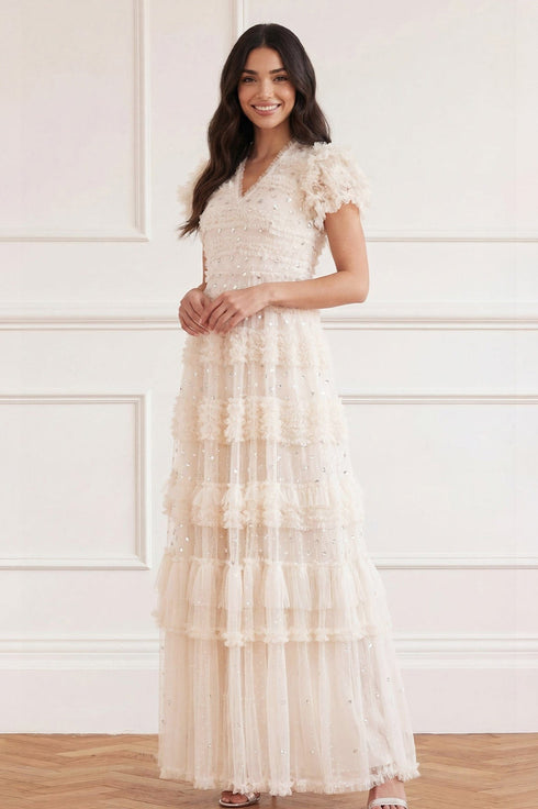 The Vivian V-Neck Gown in Cream. A signature Needle & Thread style statement. Beautifully printed with sequin polka dot motifs scattered throughout, creating an enchanting shimmer. Adorned with specially sourced sequins to create a sparkling effect throughout. This romantic style features tulle frills in perfectly positioned rows, creating a soft, frothy texture. Developed with generous ruffled sleeves and a V-neckline for a contemporary look. A style you'll wear time and time again.