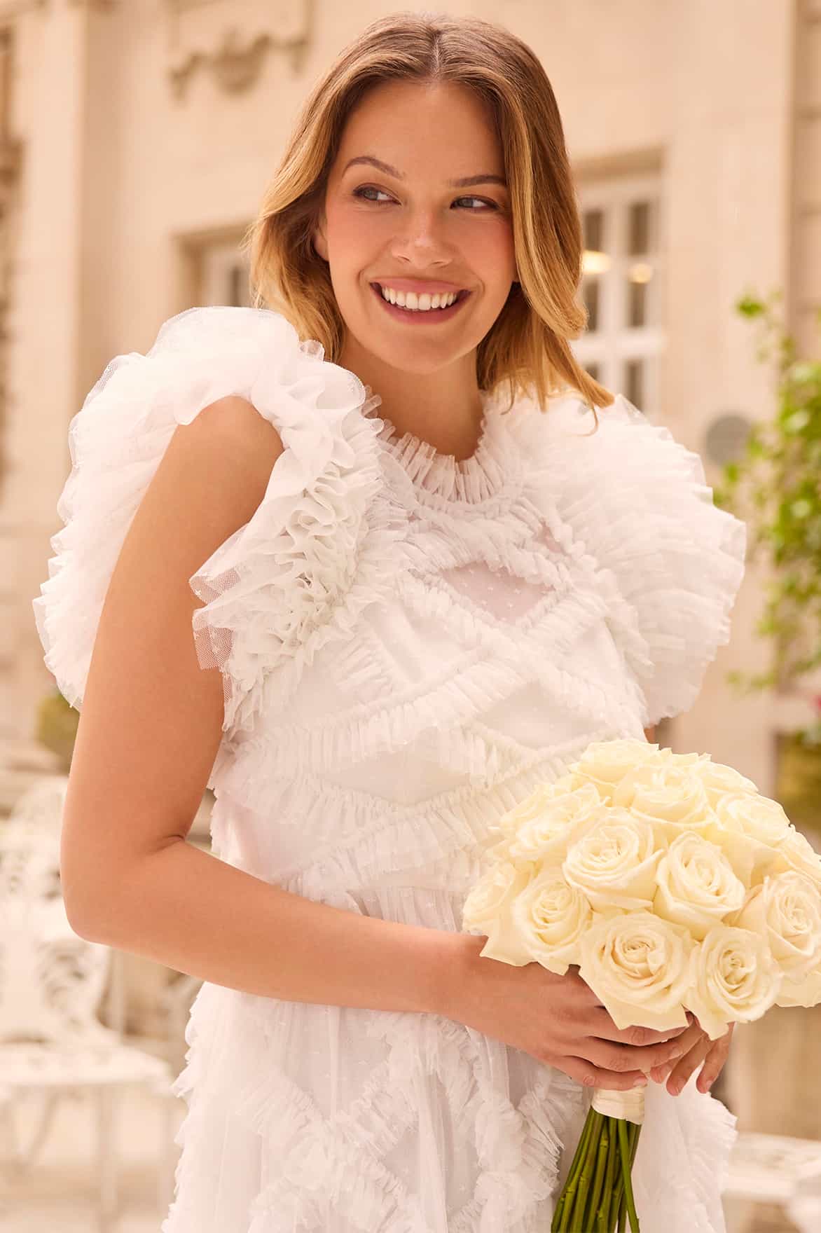 NEW SEASON. The Genevieve Ruffle Gown in Swan White. This dramatic ruffle gown captures the movement of petals drifting through warm summer air. Designed with cascading ruffle detailing across a softly sculpted bodice, the full-length skirt flows beautifully with every step.