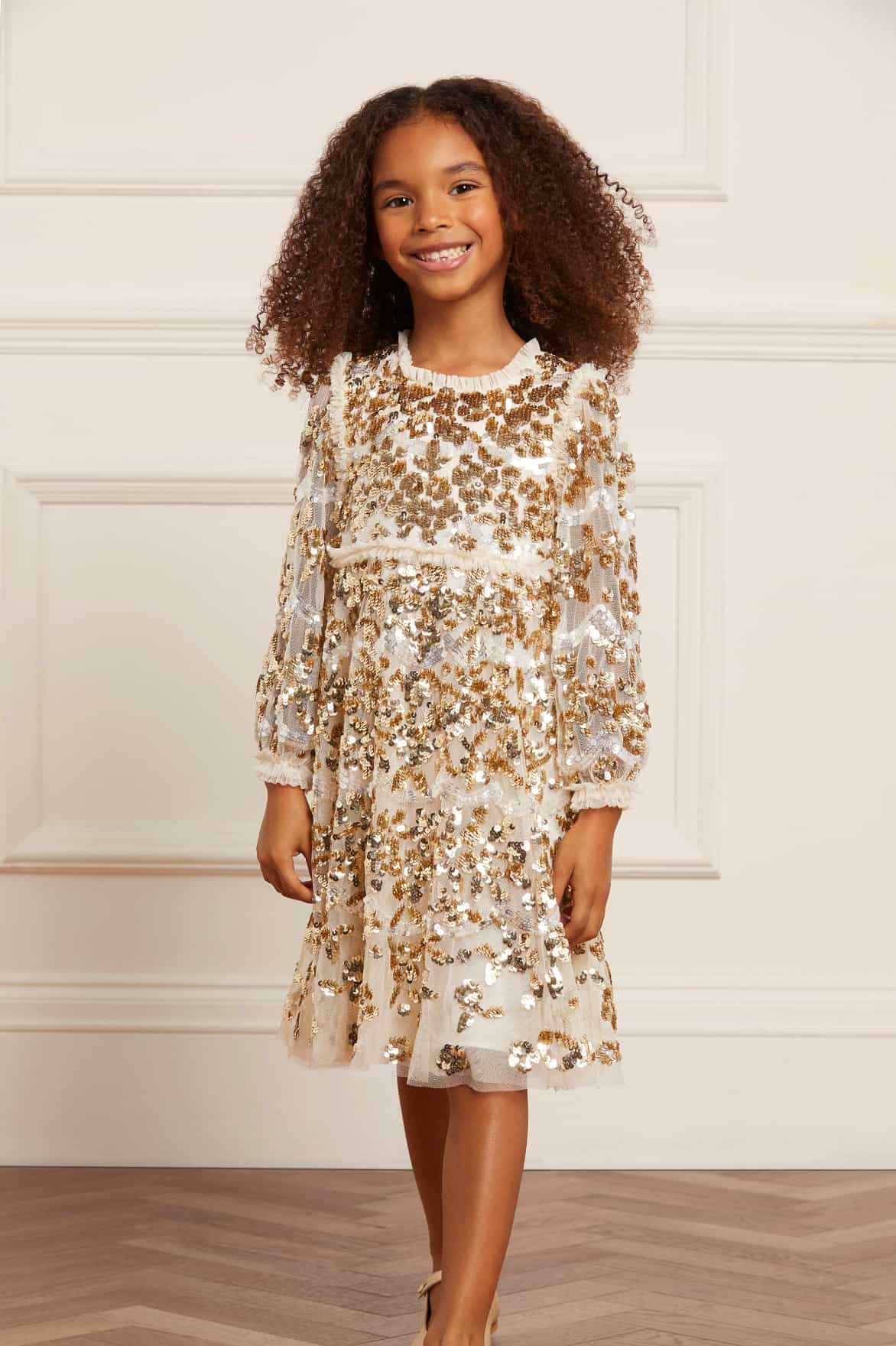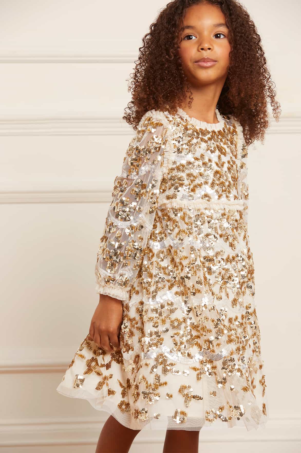 The Alicia Sequin KIDS Dress in Champagne / Gold. This KIDS style features signature Needle & Thread details. Beautifully designed with high-impact, lustrous sequins creating an all-over shimmering effect. This KIDS dress has intricate artwork featuring floral and scallop shape motifs cascading down the dress. Let your little one shine at her next event.