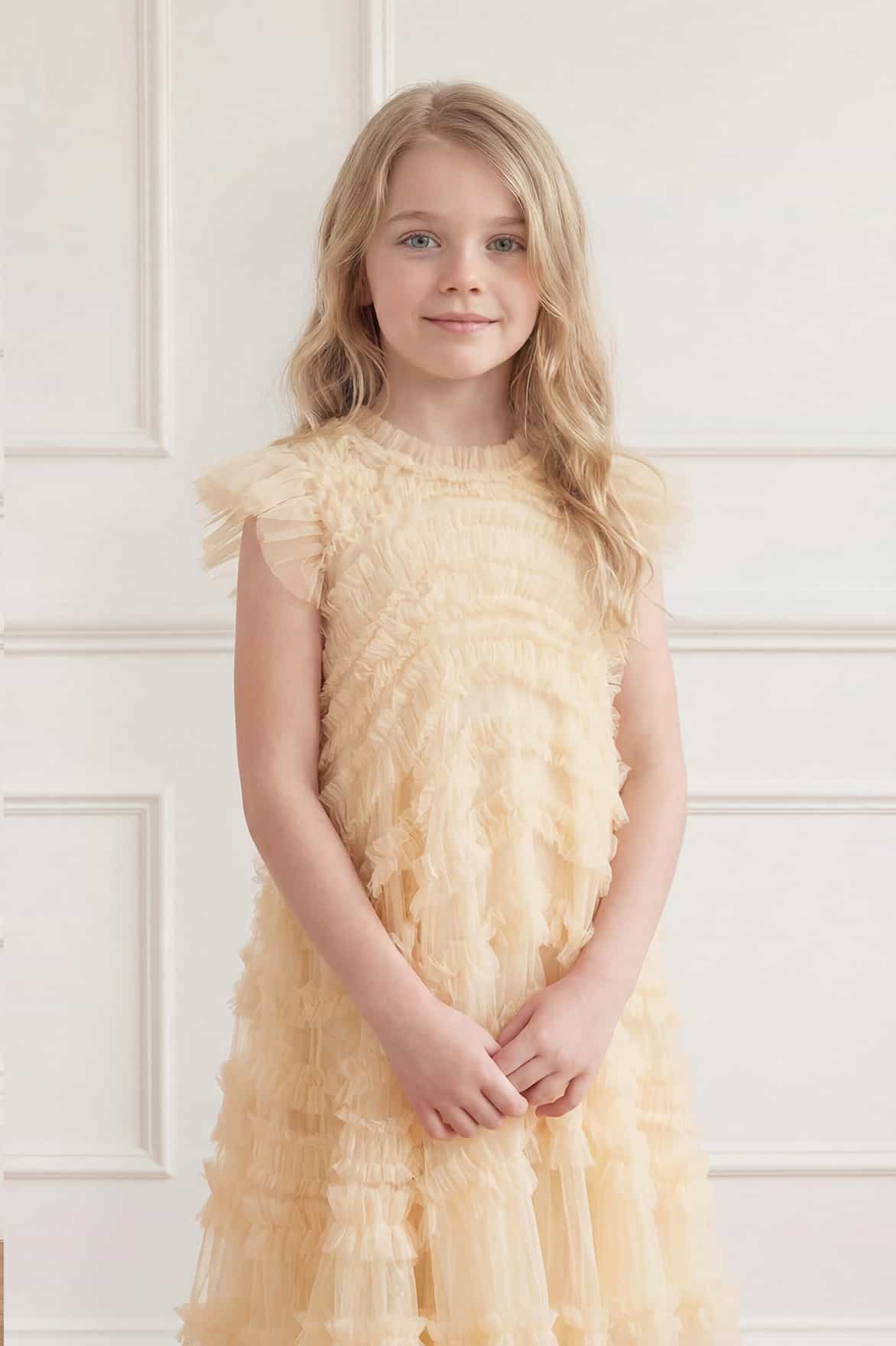 NEW SEASON | NEEDLE & THREAD EXCLUSIVE. The Amara Ruffle Sleeve Kids Dress in Lemon Sorbet. Designed with a relaxed shape, this dress features delicate ruffle sleeves and a full, twirl-worthy skirt with soft layered volume. Inspired by dreamy garden blooms, it feels light, special and comfortable. Beautifully complemented by coordinating the Amara Backless Ballerina Dress.